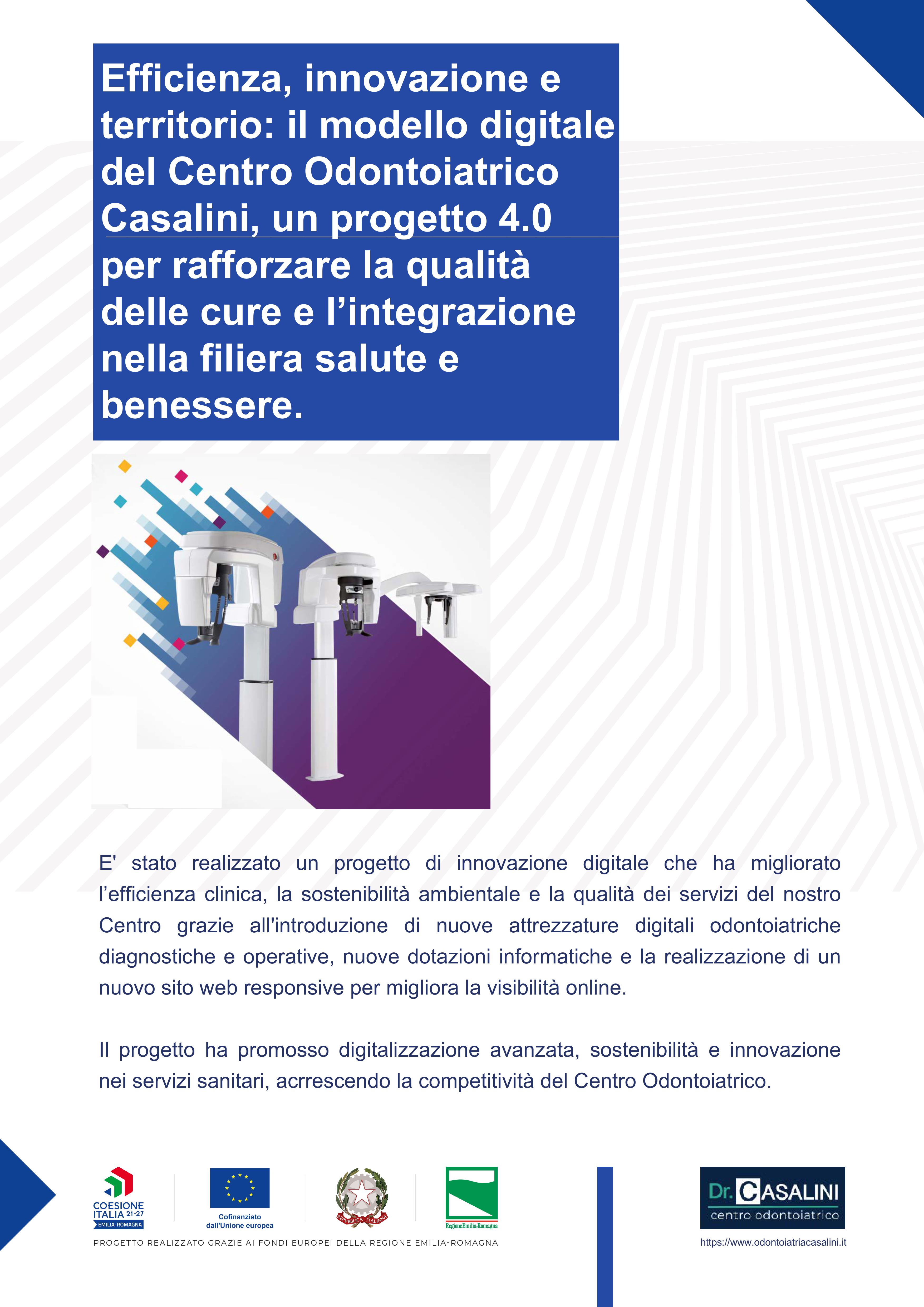 E' stato realizzato un progetto di innovazione digitale che ha migliorato l’efficienza clinica, la sostenibilità ambientale e la qualità dei servizi del nostro Centro grazie all'introduzione di nuove attrezzature digitali odontoiatriche diagnostiche e operative, nuove dotazioni informatiche e la realizzazione di un nuovo sito web responsive per migliora la visibilità online. Il progetto ha promosso digitalizzazione avanzata, sostenibilità e innovazione nei servizi sanitari, acrrescendo la competitività del Centro Odontoiatrico.